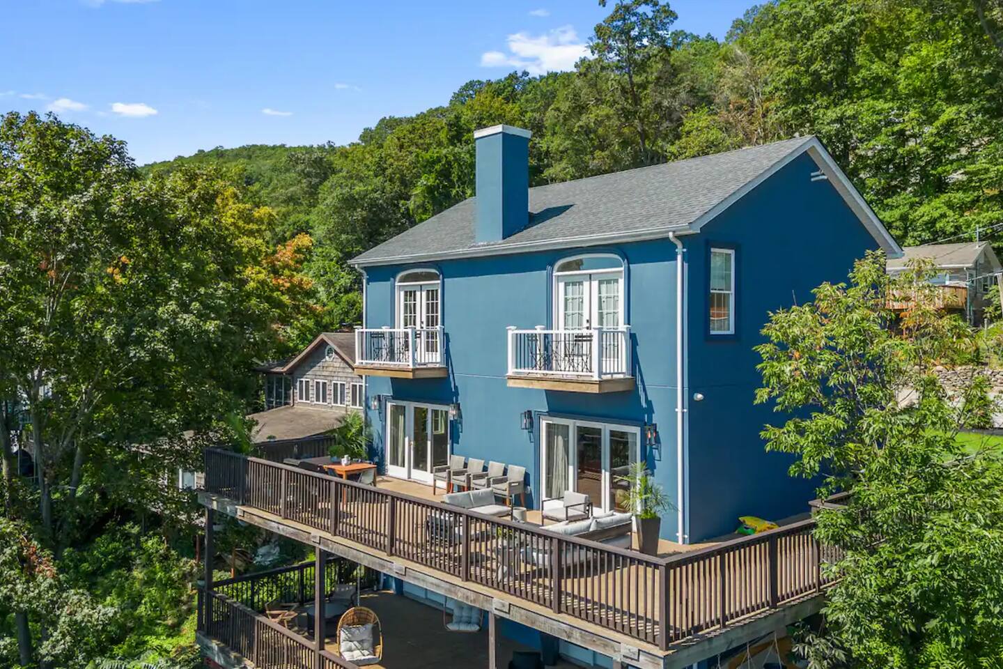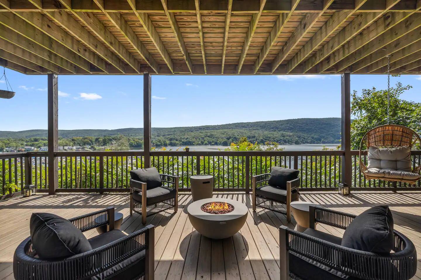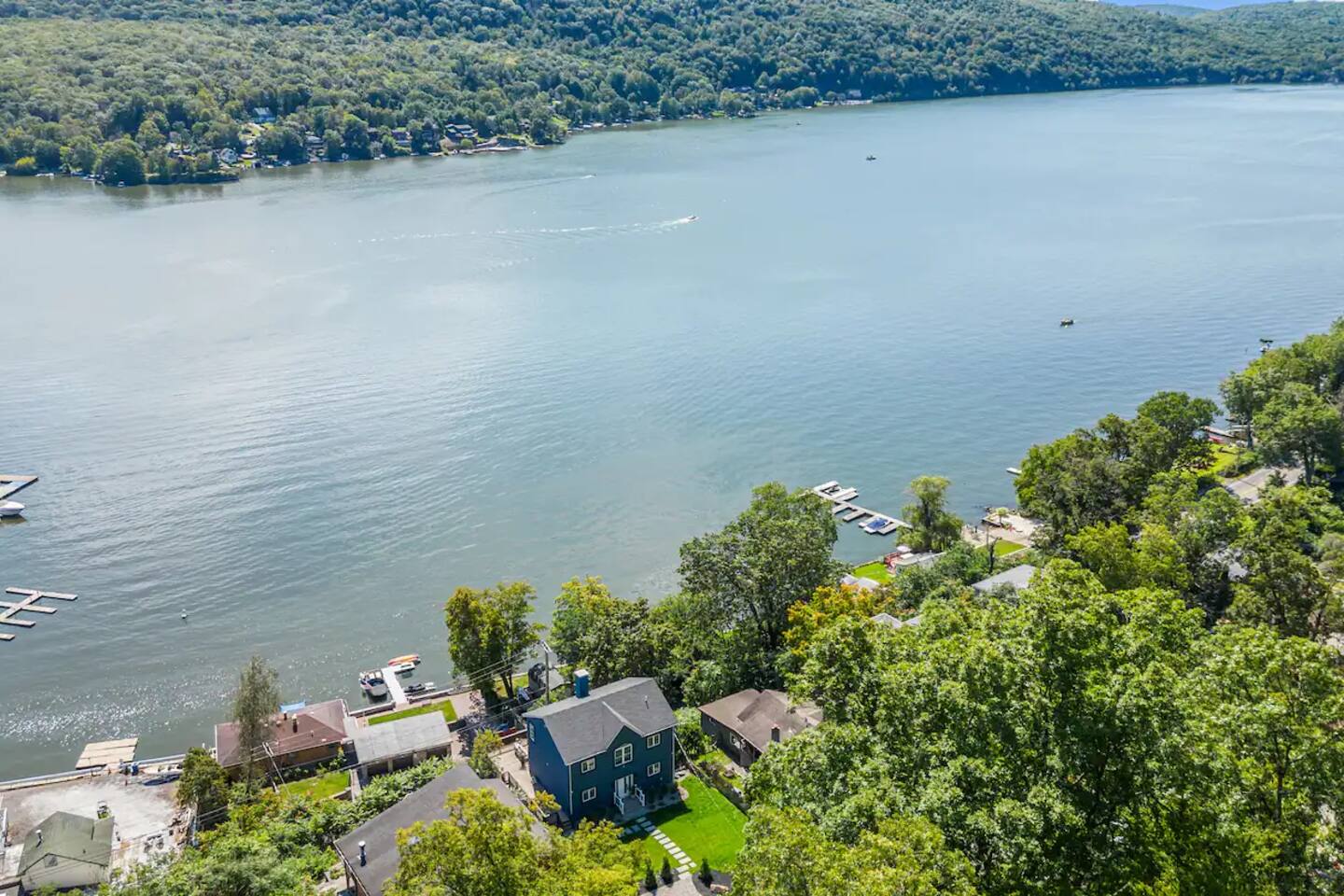 As soon as you step foot in this beautiful three-floor home, you're greeted by the stunning yet highly comfortable open-floor living area, decorated in a colorful and stylish manner that complements the picturesque lakefront location. The fully equipped kitchen blends with the dining area, offering a space to cook and enjoy tasty delicacies with your loved ones before unwinding in two relaxing living rooms, setting the scene for unforgettable evenings. Natural sunlight bursts through many windows and deck doors, making the home shine bright during the day, accenting the hardwood floors and carefully chosen furniture, and enhancing the luxurious setting. Rest in the three comfortable bedrooms, which boast 5* comforts, conveniences, and private balconies that allow you to rest and recharge after an exciting day of sightseeing and lake activities. But wait! The best is yet to come! Step out onto the two decks featuring multiple lounge seating areas and marvel at the breathtaking lake views while soaking in the luxurious hot tub, roasting marshmallows by the fire pit, or preparing tasty BBQ for a mouthwatering al fresco meal. There's so much to do in this inviting lake haven. We look forward to you experiencing its complete comfort and coziness. ★ LIVING ROOMS ★ You will feel right at home! Take a moment to unwind, sink into the comfortable sofa, watch your favorite show, or plan your upcoming Greenwood Lake adventures. ✔ Two Chic and Comfortable Sofas with Pillows ✔ Smart TV ✔ Electric Fireplace ✔ Stylish Coffee Tables ✔ Access to the Upper Deck Don't like the movie choice of the main living room? Come down to the second family space, which boasts another relaxing seating area with a beautiful bar. ✔ Comfy Sofa with Pillows ✔ Smart TV ✔ Cozy Sofa Chair ✔ Bar Area with Cocktail Mixing Equipment ✔ Access to the Lower Deck ★ KITCHEN & DINING ★ This fully equipped kitchen boasts modern appliances, making it easy to whip up anything from delicious breakfasts to gourmet dinners. With ample countertops, you'll have plenty of room to showcase your culinary skills. ✔ Microwave ✔ Stove ✔ Double Oven ✔ Toaster ✔ Blender ✔ Rice Maker ✔ Keurig Coffee Maker ✔ Hot Water Kettle ✔ Double-Door Refrigerator/Freezer ✔ Dishwasher ✔ Sink - Hot & Cold Water ✔ Plates ✔ Glasses ✔ Silverware ✔ Pots & Pans Unwind and catch up with your loved ones on the lavish deck while the food is prepared. When done, gather at the dining table and savor a delicious meal in a warm and inviting atmosphere. ✔ Dining Table with Seating for 6 ✔ Kitchen Island with Seating for 3 ★ SLEEPING ARRANGEMENTS – 3 BEDROOMS ★ After an exciting day of exploring the lake attractions and natural landmarks, you will look to rest for an equally entertaining tomorrow. Once you are ready to relax, please make your way to these comfortable bedrooms. ♛ Master Bedroom (Downstairs): King-Size Bed, Deck Access, Ensuite Bathroom ♛ Bedroom 2 (Upstairs): Queen-Size Bed, Private Balcony ♛ Bedroom 3 (Upstairs): Two Full-Size Beds, Private Balcony All bedrooms share a similar set of amenities. ✔ Premium Mattresses, Linens, Sheets, and Pillows ✔ Closets with Hangers and Shelves ✔ Dressers with Spacious Drawers ✔ Night Stands with Reading Lamps ★ BATHROOMS ★ In addition to the master bedroom's ensuite bathroom, the home features another full bathroom that caters to the remaining bedrooms and the convenient half bath accessible from the living area. All are stocked with essential toiletries and pampering towels to ensure a carefree stay. ✔ Soaker Bathtub + Separate Walk-In Shower (Master Bath) ✔ Bathtub with a Shower ✔ Vanity (Double in the Master Bath) ✔ Mirror ✔ Toilet ✔ Towels ✔ Hair Dryer ✔ Essential Toiletries ★ OUTDOORS ★ A stunning lakefront getaway would not be complete without a private space where you can take in the serenity of the outdoors. Choose from two spacious decks on two floors, allowing you to gaze at the breathtaking lake views while relaxing in the luxury hot tub, soaking up the sun, preparing a tasty BBQ, and sharing these unforgettable moments with your loved ones. ✔ Luxurious Hot Tub ✔ Fire Pit with Surrounding Seating ✔ Dining Table with Seating for 8 ✔ BBQ Grill ✔ Lounge Seating Areas ✔ Hanging Egg Chairs Find your happiness in this gorgeous getaway. It offers a place to escape the hustle and bustle of everyday life, take in the stunning views, unwind in the hot tub, and explore exciting Greenwood Lake attractions. Please let us know if you have any questions regarding our retreat. Happy Travels! Permit # 23-152