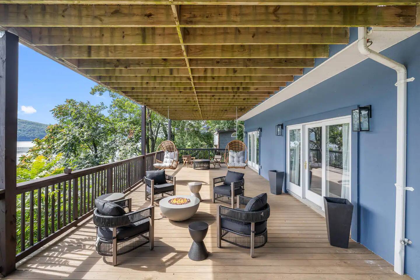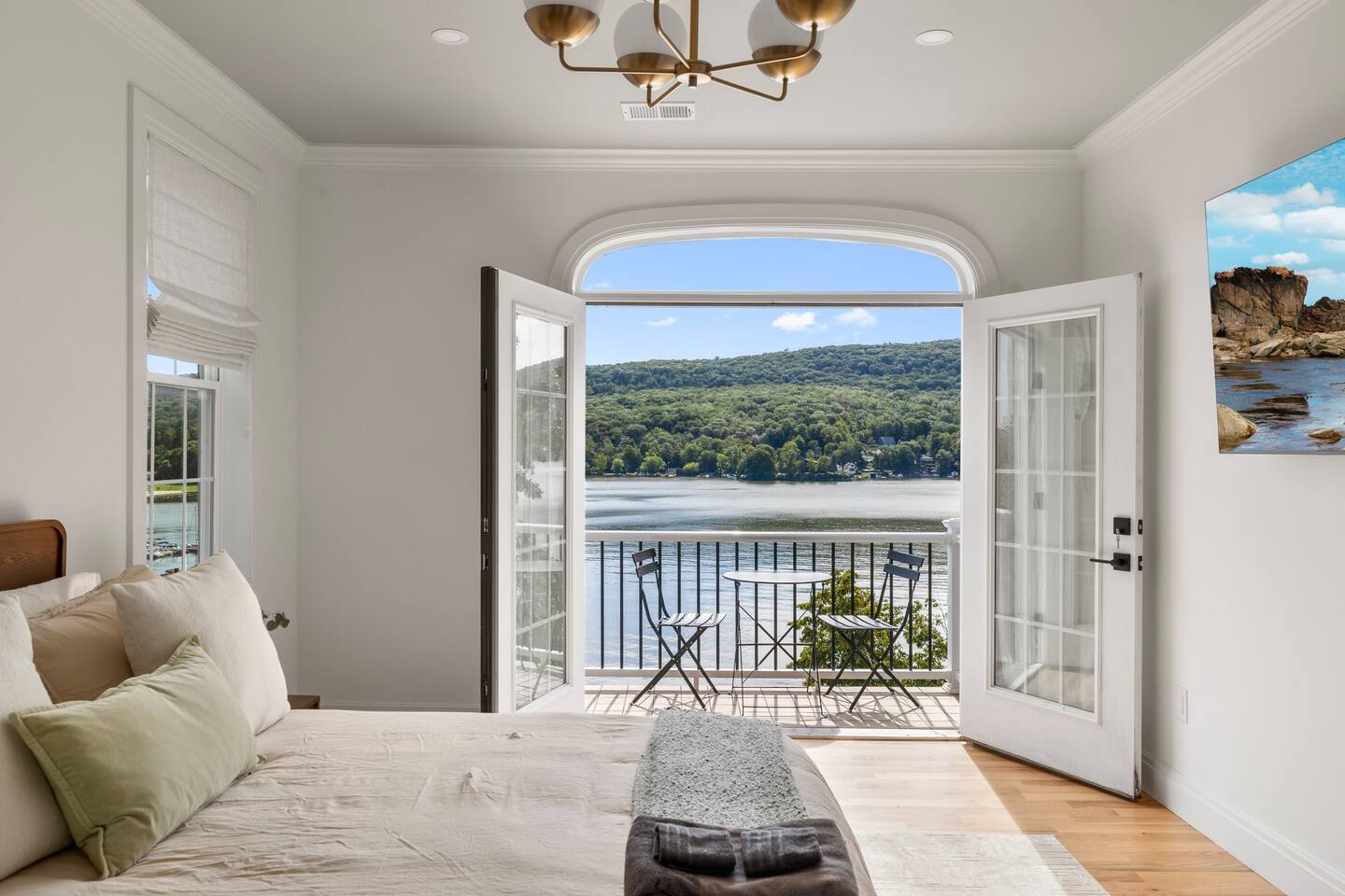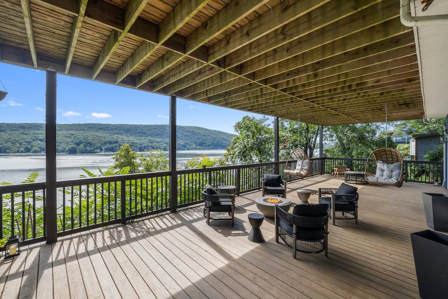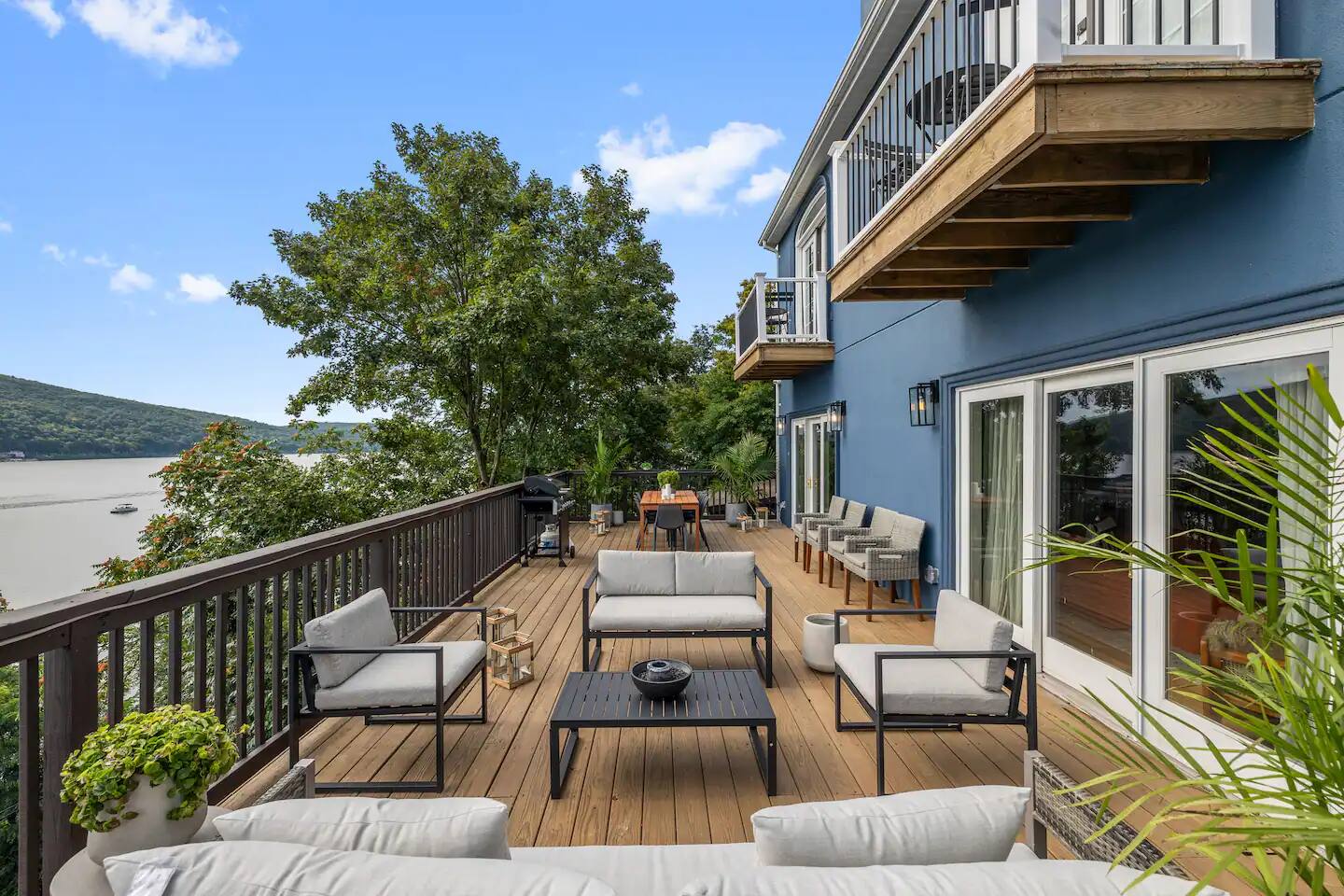 As soon as you step foot in this beautiful three-floor home, you're greeted by the stunning yet highly comfortable open-floor living area, decorated in a colorful and stylish manner that complements the picturesque lakefront location. The fully equipped kitchen blends with the dining area, offering a space to cook and enjoy tasty delicacies with your loved ones before unwinding in two relaxing living rooms, setting the scene for unforgettable evenings. Natural sunlight bursts through many windows and deck doors, making the home shine bright during the day, accenting the hardwood floors and carefully chosen furniture, and enhancing the luxurious setting. Rest in the three comfortable bedrooms, which boast 5* comforts, conveniences, and private balconies that allow you to rest and recharge after an exciting day of sightseeing and lake activities. But wait! The best is yet to come! Step out onto the two decks featuring multiple lounge seating areas and marvel at the breathtaking lake views while soaking in the luxurious hot tub, roasting marshmallows by the fire pit, or preparing tasty BBQ for a mouthwatering al fresco meal. There's so much to do in this inviting lake haven. We look forward to you experiencing its complete comfort and coziness. ★ LIVING ROOMS ★ You will feel right at home! Take a moment to unwind, sink into the comfortable sofa, watch your favorite show, or plan your upcoming Greenwood Lake adventures. ✔ Two Chic and Comfortable Sofas with Pillows ✔ Smart TV ✔ Electric Fireplace ✔ Stylish Coffee Tables ✔ Access to the Upper Deck Don't like the movie choice of the main living room? Come down to the second family space, which boasts another relaxing seating area with a beautiful bar. ✔ Comfy Sofa with Pillows ✔ Smart TV ✔ Cozy Sofa Chair ✔ Bar Area with Cocktail Mixing Equipment ✔ Access to the Lower Deck ★ KITCHEN & DINING ★ This fully equipped kitchen boasts modern appliances, making it easy to whip up anything from delicious breakfasts to gourmet dinners. With ample countertops, you'll have plenty of room to showcase your culinary skills. ✔ Microwave ✔ Stove ✔ Double Oven ✔ Toaster ✔ Blender ✔ Rice Maker ✔ Keurig Coffee Maker ✔ Hot Water Kettle ✔ Double-Door Refrigerator/Freezer ✔ Dishwasher ✔ Sink - Hot & Cold Water ✔ Plates ✔ Glasses ✔ Silverware ✔ Pots & Pans Unwind and catch up with your loved ones on the lavish deck while the food is prepared. When done, gather at the dining table and savor a delicious meal in a warm and inviting atmosphere. ✔ Dining Table with Seating for 6 ✔ Kitchen Island with Seating for 3 ★ SLEEPING ARRANGEMENTS – 3 BEDROOMS ★ After an exciting day of exploring the lake attractions and natural landmarks, you will look to rest for an equally entertaining tomorrow. Once you are ready to relax, please make your way to these comfortable bedrooms. ♛ Master Bedroom (Downstairs): King-Size Bed, Deck Access, Ensuite Bathroom ♛ Bedroom 2 (Upstairs): Queen-Size Bed, Private Balcony ♛ Bedroom 3 (Upstairs): Two Full-Size Beds, Private Balcony All bedrooms share a similar set of amenities. ✔ Premium Mattresses, Linens, Sheets, and Pillows ✔ Closets with Hangers and Shelves ✔ Dressers with Spacious Drawers ✔ Night Stands with Reading Lamps ★ BATHROOMS ★ In addition to the master bedroom's ensuite bathroom, the home features another full bathroom that caters to the remaining bedrooms and the convenient half bath accessible from the living area. All are stocked with essential toiletries and pampering towels to ensure a carefree stay. ✔ Soaker Bathtub + Separate Walk-In Shower (Master Bath) ✔ Bathtub with a Shower ✔ Vanity (Double in the Master Bath) ✔ Mirror ✔ Toilet ✔ Towels ✔ Hair Dryer ✔ Essential Toiletries ★ OUTDOORS ★ A stunning lakefront getaway would not be complete without a private space where you can take in the serenity of the outdoors. Choose from two spacious decks on two floors, allowing you to gaze at the breathtaking lake views while relaxing in the luxury hot tub, soaking up the sun, preparing a tasty BBQ, and sharing these unforgettable moments with your loved ones. ✔ Luxurious Hot Tub ✔ Fire Pit with Surrounding Seating ✔ Dining Table with Seating for 8 ✔ BBQ Grill ✔ Lounge Seating Areas ✔ Hanging Egg Chairs Find your happiness in this gorgeous getaway. It offers a place to escape the hustle and bustle of everyday life, take in the stunning views, unwind in the hot tub, and explore exciting Greenwood Lake attractions. Please let us know if you have any questions regarding our retreat. Happy Travels! Permit # 23-152
